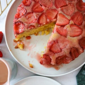 There are a couple different ways you can do an upside down cake, but I always start off with a layer of butter mixed with sugar. This is partly to stop the cake sticking, but also to help create a delicious layer of fruity goodness by the time you add your strawberries.