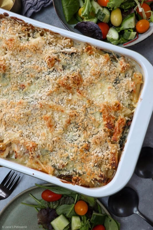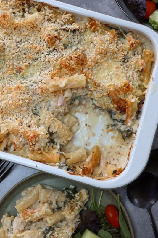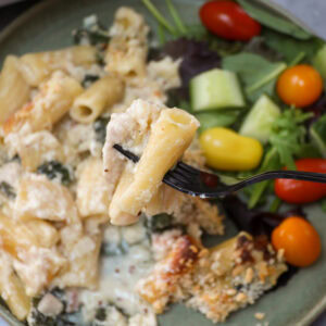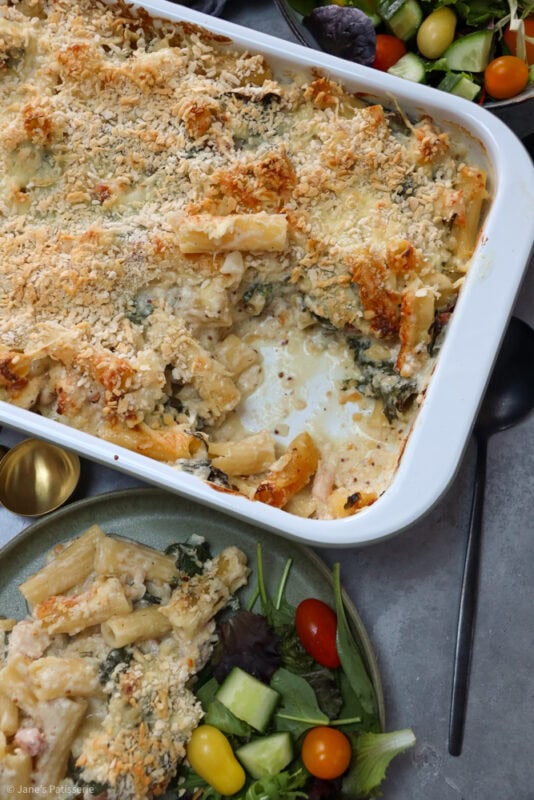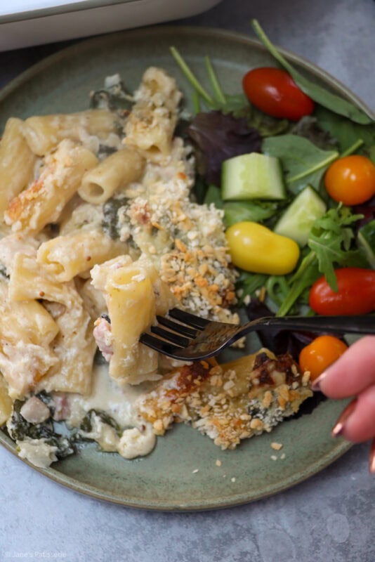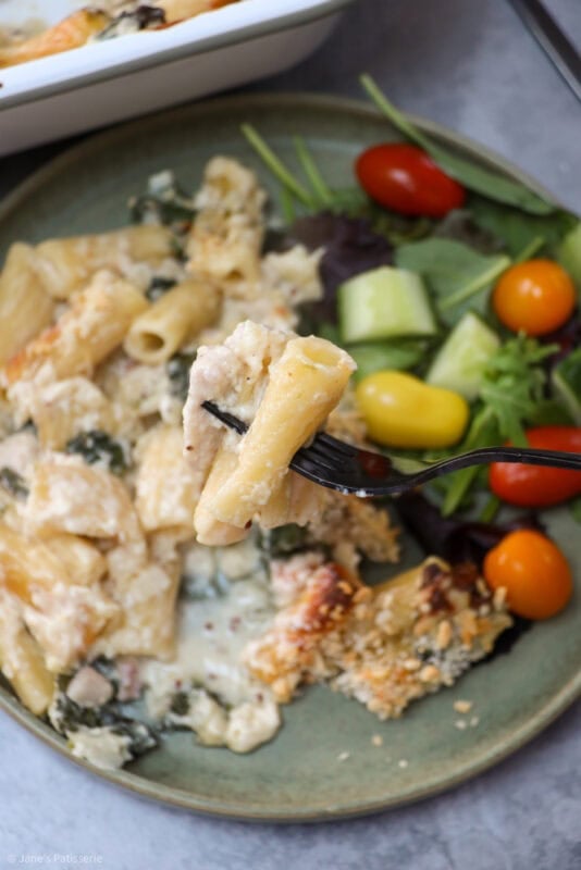 A deliciously easy weeknight dinner idea with a chicken Alfredo pasta bake – a creamy sauce with chicken, pancetta, spinach and topped with cheese, it’s delightful.