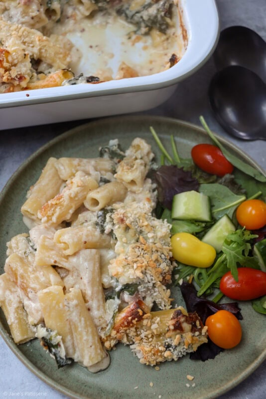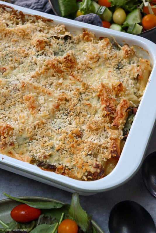 You can also swap the pasta for gnocchi if you want to try something indulgent and delicious, or even something else such as orzo. The pasta (cooked at least 2 minutes less than the packet) just mixes through the sauce after it’s made, and then poured into the baking dish. I use a medium sized baking dish, but pretty much any size dish works as long as it fits.
