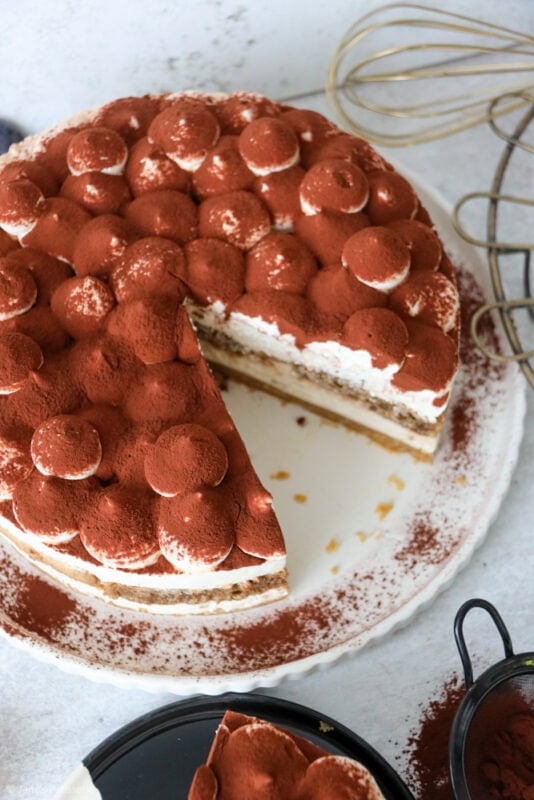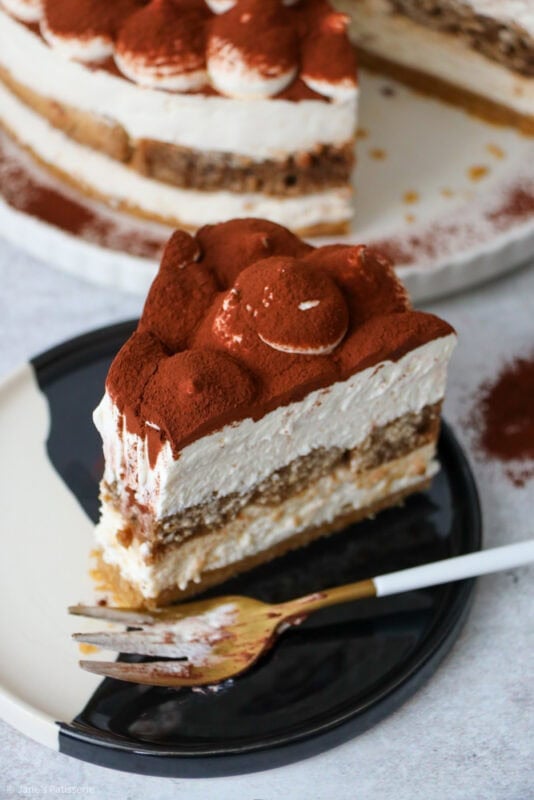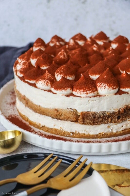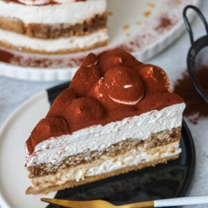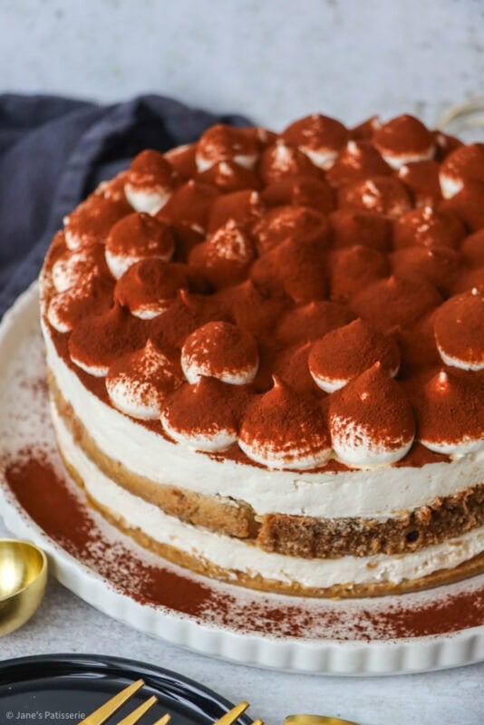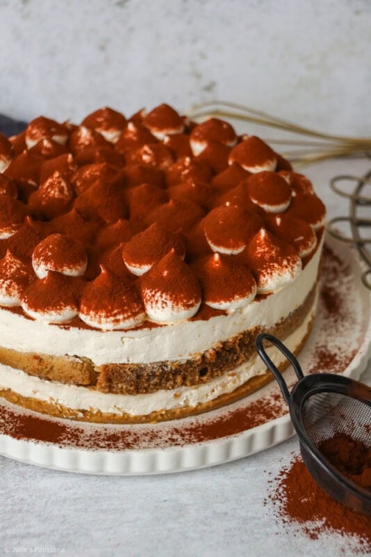 And for the iconic look, I add a little dusting of cocoa powder to the top of the cheesecake – for flavour, for decoration, for deliciousness. It’s a simple yet affective way of decorating a tiramisu cheesecake.