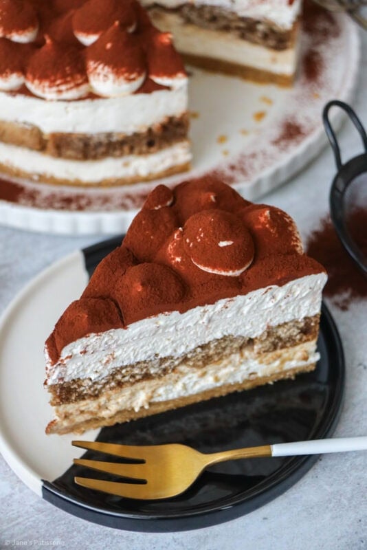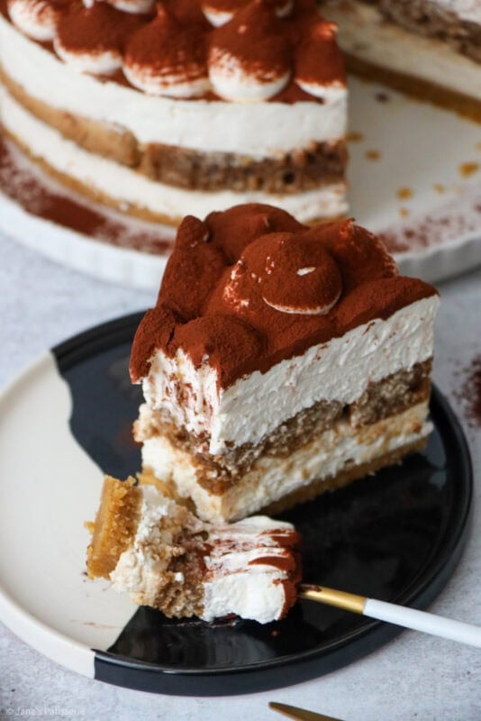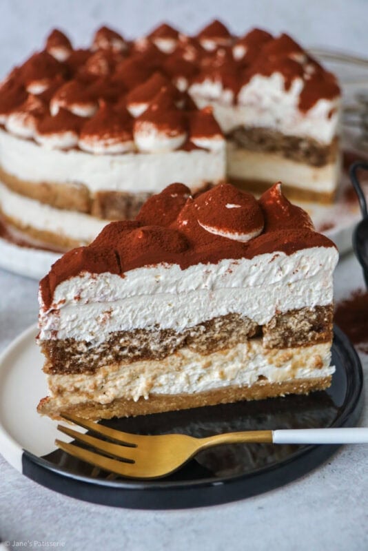 A delicious creamy tiramisu cheesecake recipe with a biscuit base, mascarpone cheesecake filling, coffee soak sponge fingers and more