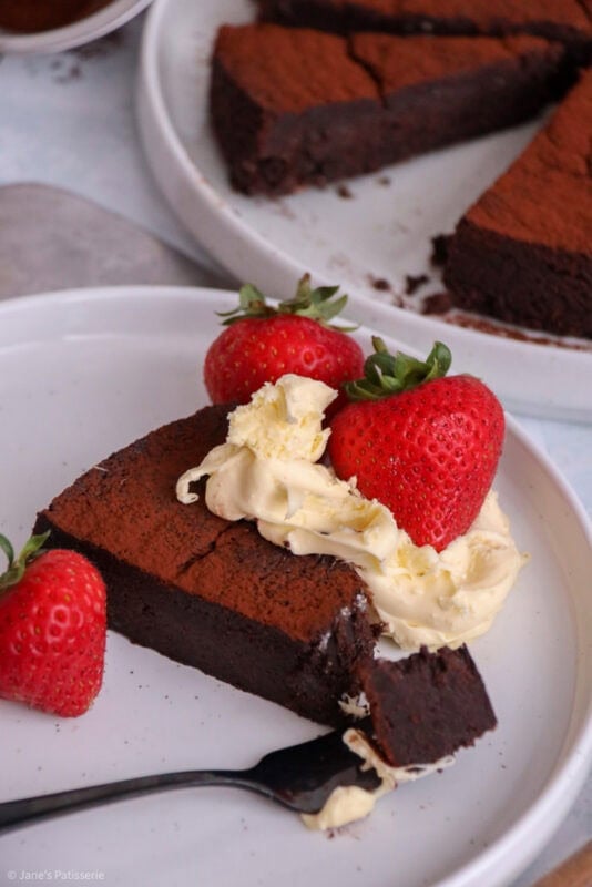 I love to serve my flourless chocolate cake with a dollop of lightly whipped cream, or clotted cream for extra taste, and then some fresh berries to cut through the thick chocolate nature of the flavour. You can of course serve it however you want.