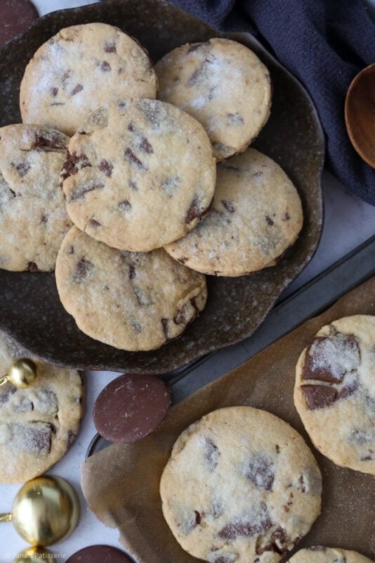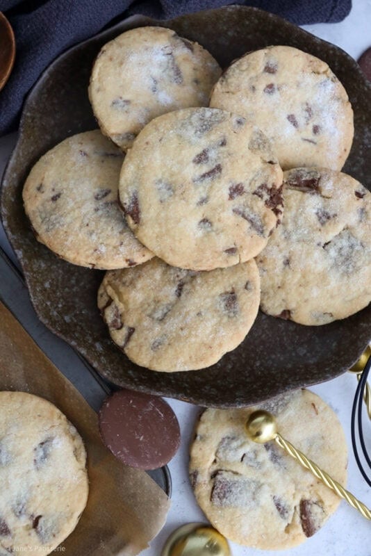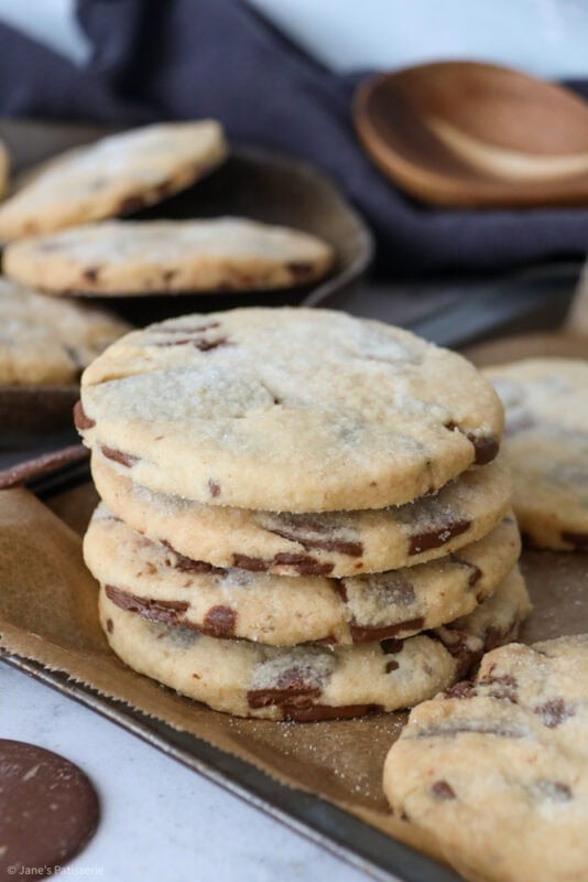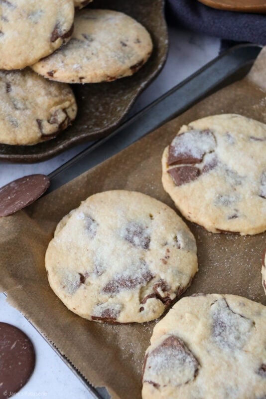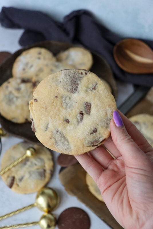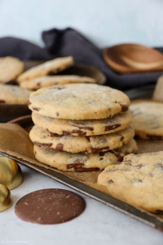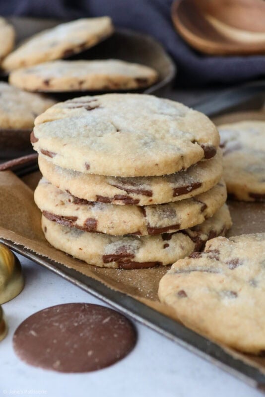 Simple six ingredient chocolate button studded shortbread cookies that are a delicious dupe of the Marks & Spencers viral bake.