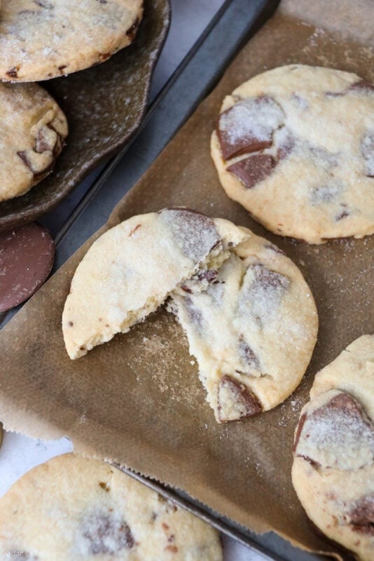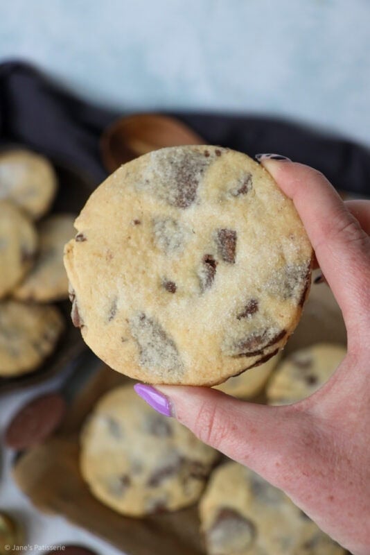 Sometimes, some brands of chocolate can create a crunchier texture (cadburys) so personally I would recommend not using them – I use the M&S chocolate buttons, but the Aldi ones work well, or you can just switch up for a chocolate bar or chips if you don’t want to use chocolate buttons. Some buttons may also go hard in the oven if your oven runs hotter, or the cookies are any thinner/smaller. To avoid this, it’s best to chop up chocolate or use chocolate chips