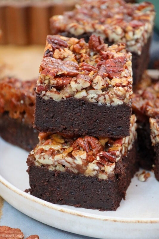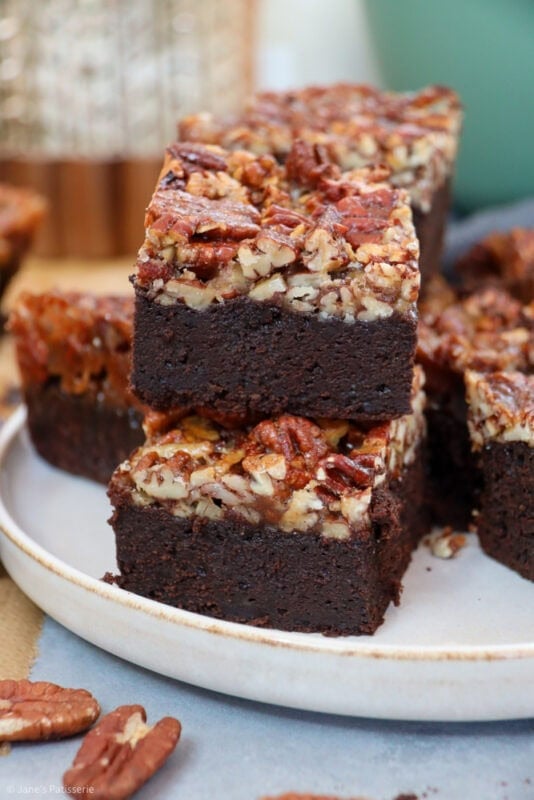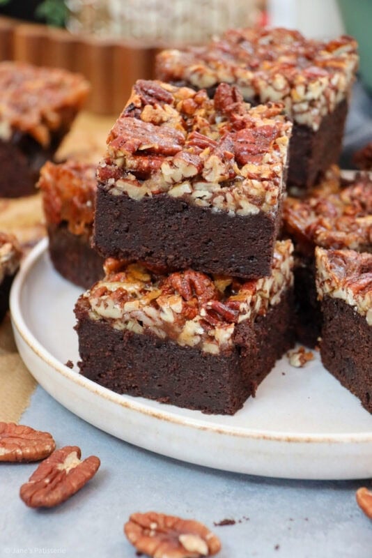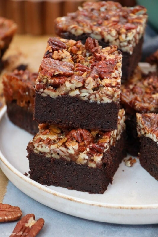 One of my all-time favourite recipes is my classic triple chocolate brownie, which has become the base for so many of my other decadent brownie creations, including this show-stopping pecan pie brownie. It starts with a rich, fudgy brownie layer made from just six simple ingredients: dark chocolate, butter, eggs, sugar, flour, and cocoa powder. Then it’s topped with a sticky, sweet, and nutty pecan pie layer that takes this recipe to the next level.