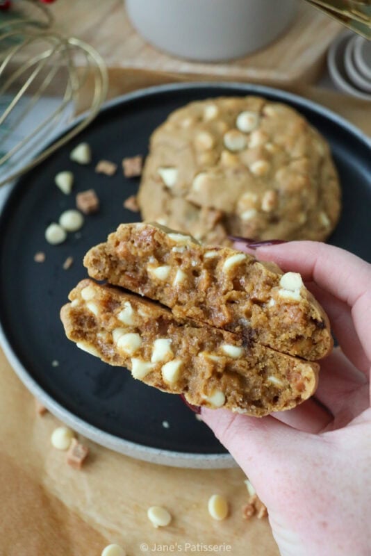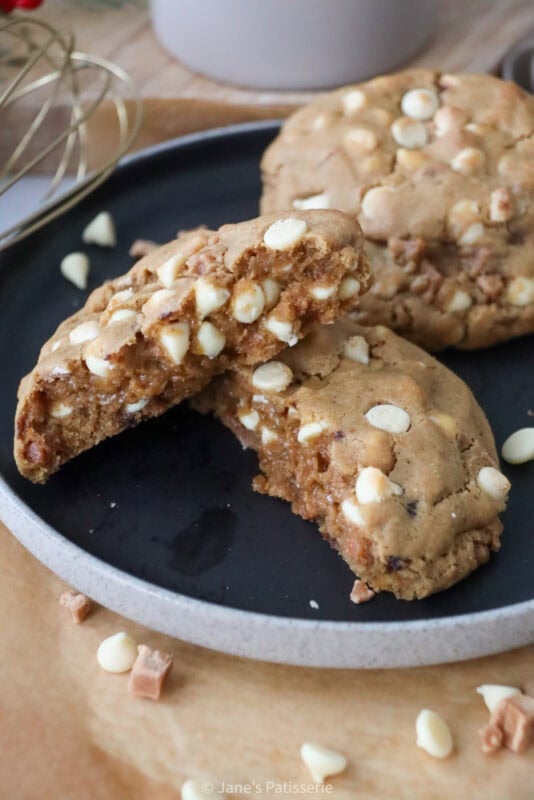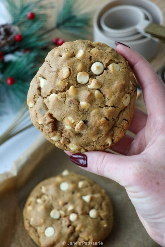 Inspired by classic festive flavours and cosy winter baking traditions, these soft gingerbread cookies are made with brown sugar, and a warming blend of ground ginger, cinnamon, and nutmeg. Unlike your regular gingerbread, this version is thick, tender, and bakery-style – the kind of chewy gingerbread cookie that melts in your mouth with white chocolate and fudge pieces added in.