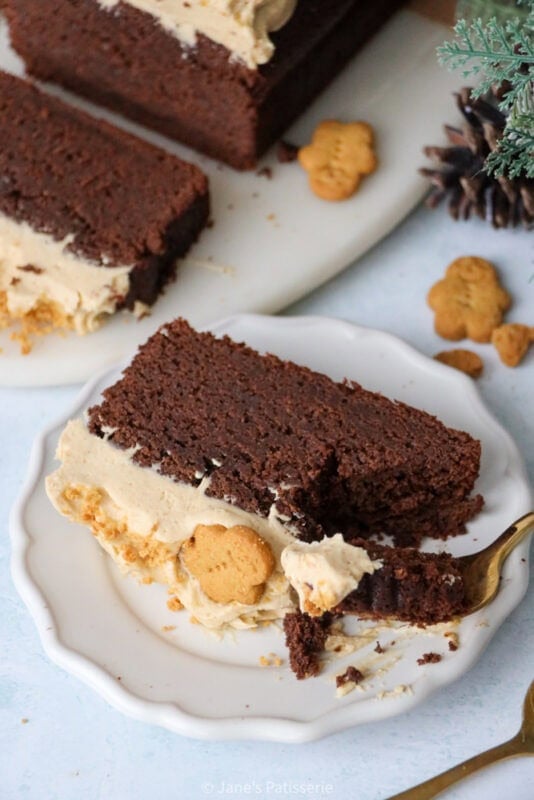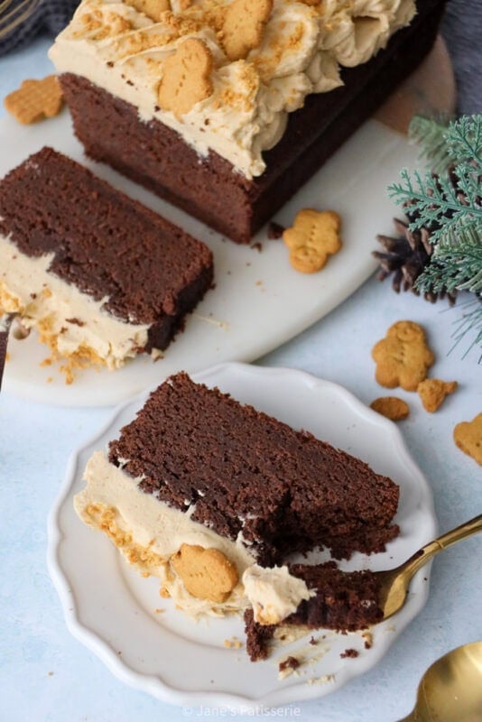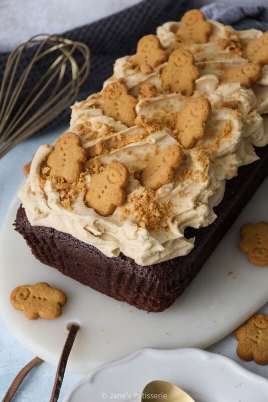 I decided to just dollop the frosting on top, and add some gingerbread people biscuits and crumbs for decoration, but you can do what you want. I love the thick but light nature of a cream cheese frosting, and it works wonderfully with a dense but fudgy cake like this sponge.
