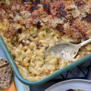 I pour the cooked pasta into my baking dish, and then pour on the cheese sauce. Stir this together, and then you can either bake now, or finish it off like I do. To make it even more cheeseboard like, I dollop on some small spoonfuls of chutney (caramelised onion is my go to choice, and again, always leftover on the cheeseboard) and I also crumble over some crackers for a nice crunch.