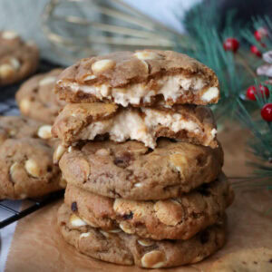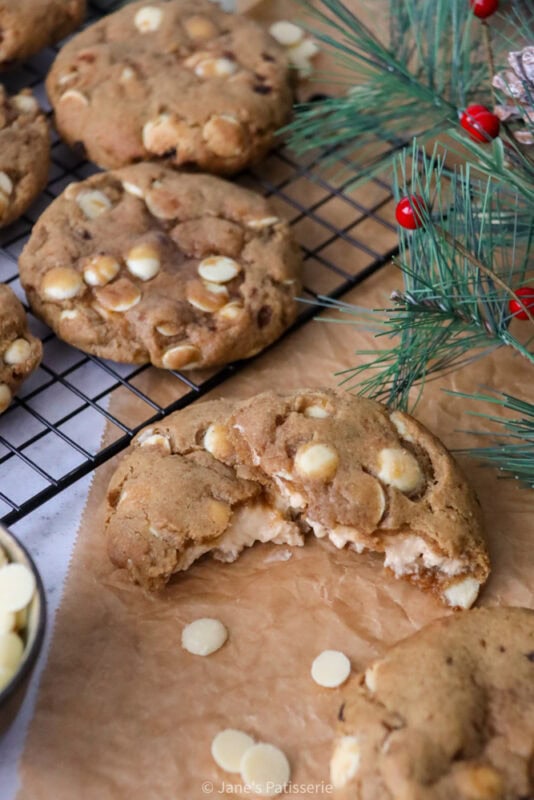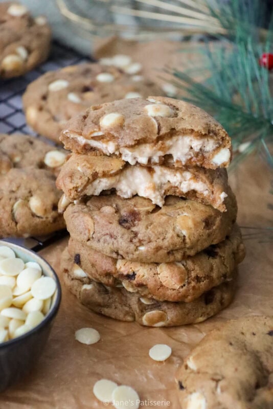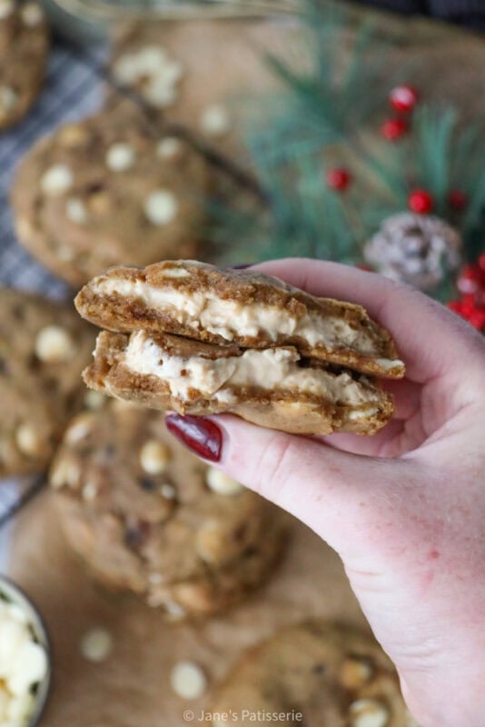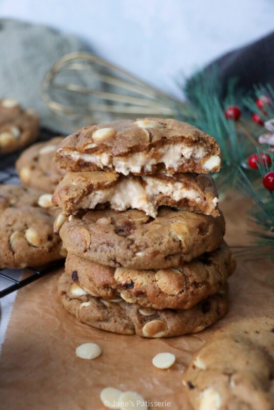 These cookies are a marriage of my all time viral favourite, my gingerbread nyc cookies, and then also my salted caramel cheesecake cookies. I know I keep talking about these style of cookies, but I adore them and you all requested another fun version so here we are.