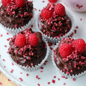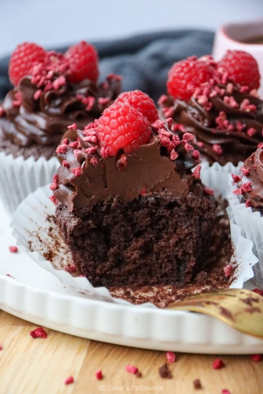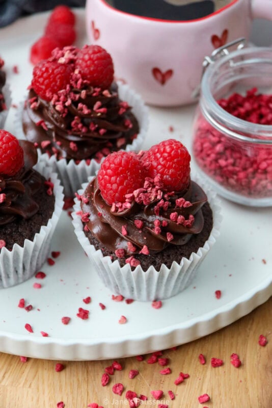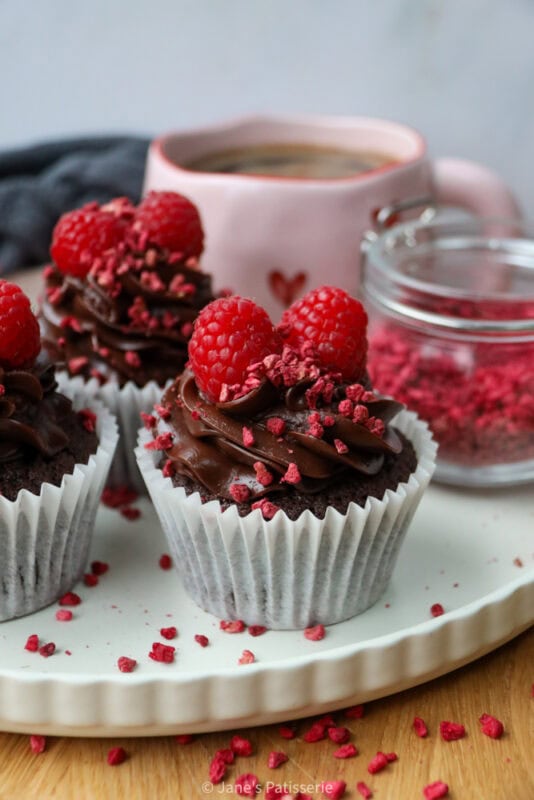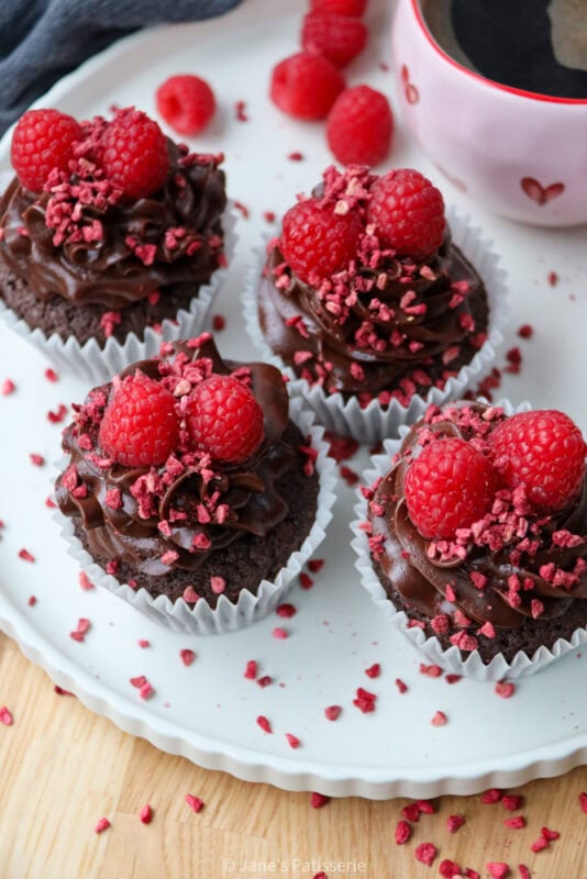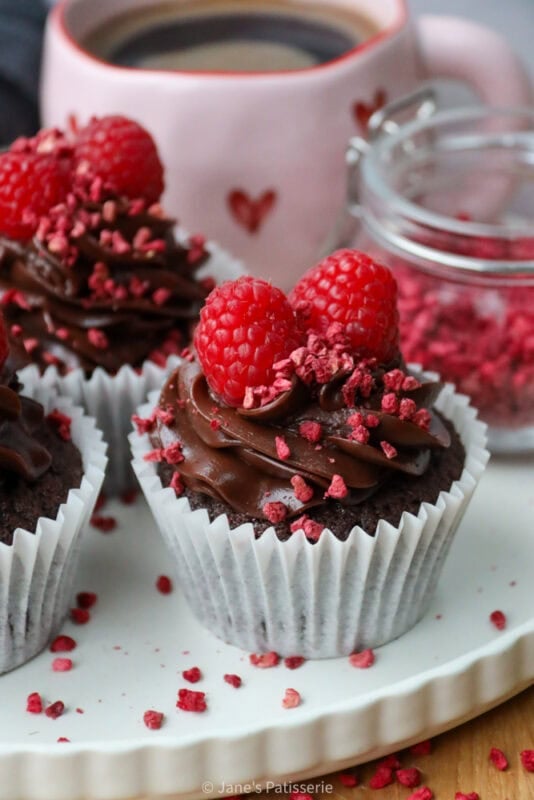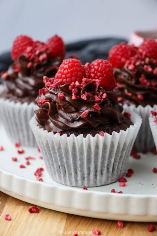Leave the ganache to sit on the side to thicken and start to set to a peanut butter style consistency, and then it’s ready to pipe. I usually make the ganache as the cupcakes are baking, so it’s had time to thicken whilst the cupcakes bake and cool. I used a 2d closed star piping tip to pipe my ganache on top, before topping with raspberries and freeze dried raspberries.