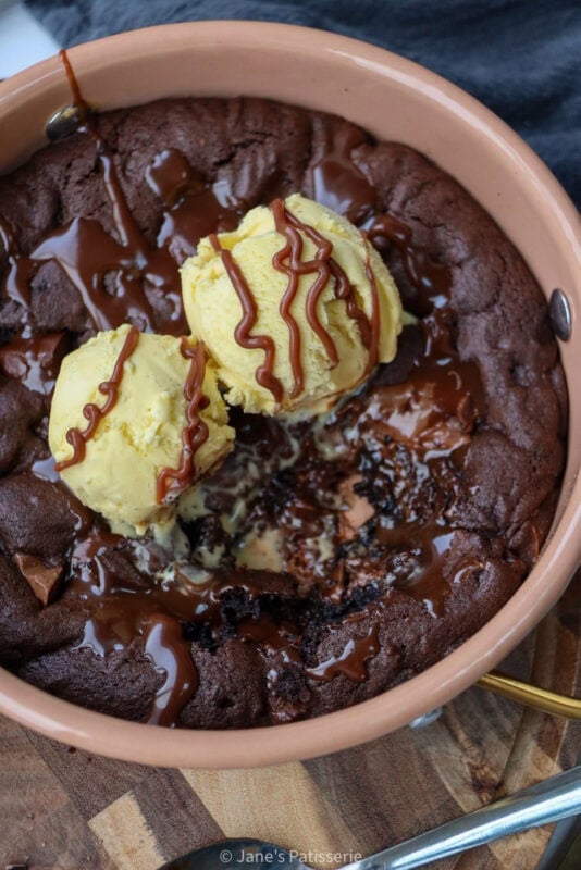 I used a baking dish that was 15cm wide, so anything around that size would work well. A small baking dish, or pie dish is great for this, as ideally you can serve the cookie dough directly in what you have baked it in. (My dish was from Habitat a long time ago)