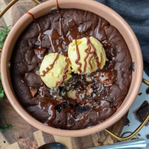 I like to serve mine with a scoop of ice cream, and a drizzle of chocolate sauce – but chocolate ice cream, caramel ice cream, any ice cream would be GREAT. I personally love the contrast of a warm pudding with a cold ice cream. You can also drizzle with caramel, or leave it as it is.