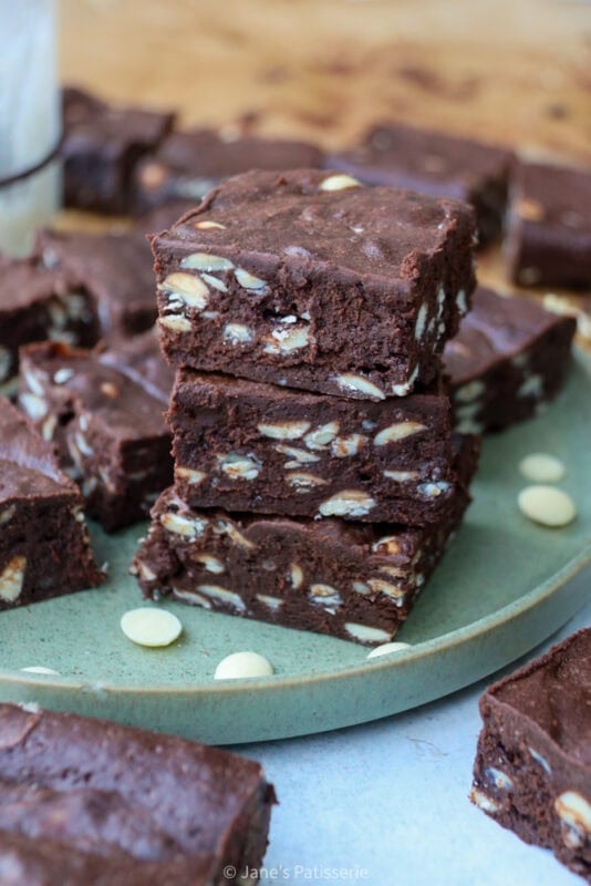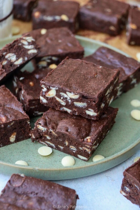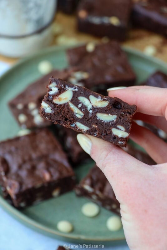 I bake my brownies until there is a small wobble in the middle, but sometimes this can be hard to see. It’s best to let the brownies cool fully in a tin because this helps them set into shape, and then also setting in the fridge helps perfect that texture.